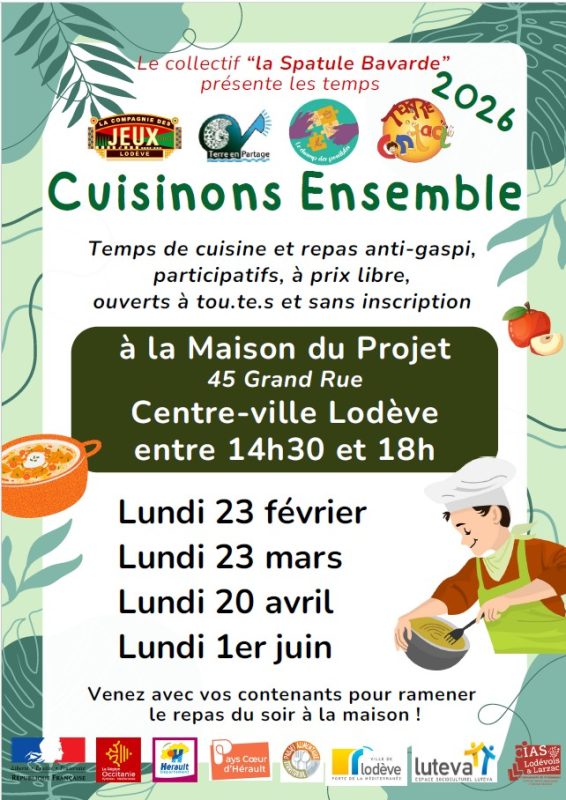 Cuisinons ensemble à la Maison du Projet dans Atelier, Culture, Rencontre, Solidarité, Tout public / familles Dans 23 mars 2026 Durée 14h30 - 18h00 Maison du Projet 45 grand rue 34700 Lodève