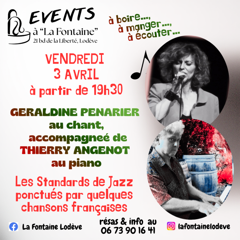 Events à « La Fontaine » : Geraldine Penarier au chant, accompagnée de Thierry Angenot au piano dans Concert, Culture, Rencontre, Spectacle, Tout public / familles Dans 3 avril 2026 Durée 19h30